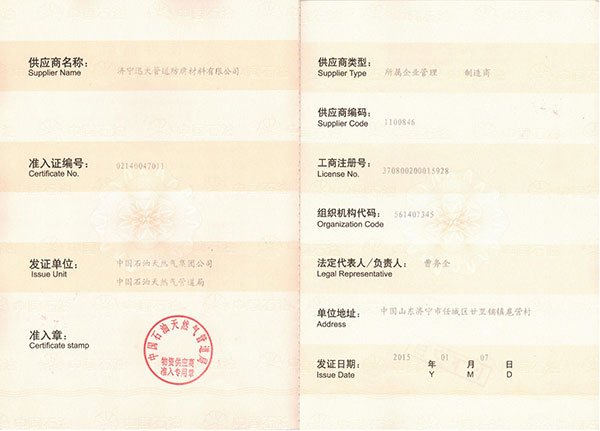 中國(guó)石油天然氣集團(tuán)公司物資供應(yīng)商準(zhǔn)入證